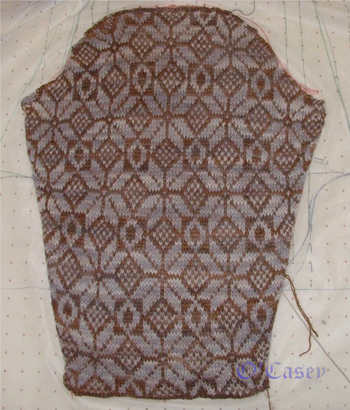 Work Royal Diamonds stitch repeat almost 8 times, starting to shape the armhole in the 17th row of the last repeat.